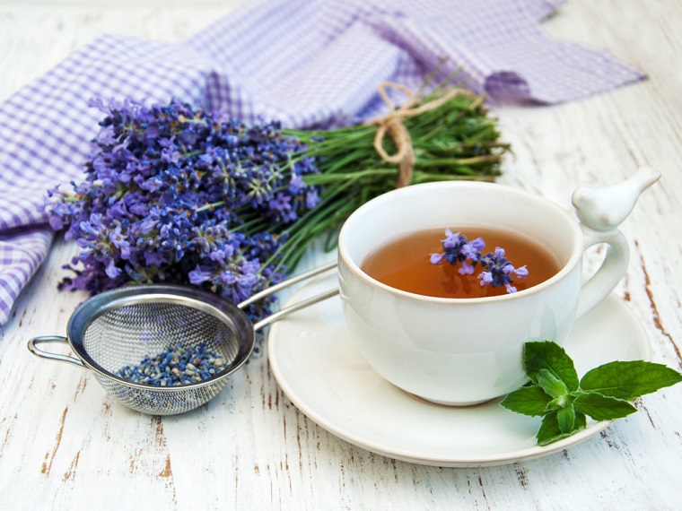 Cup of tea and lavender flowers